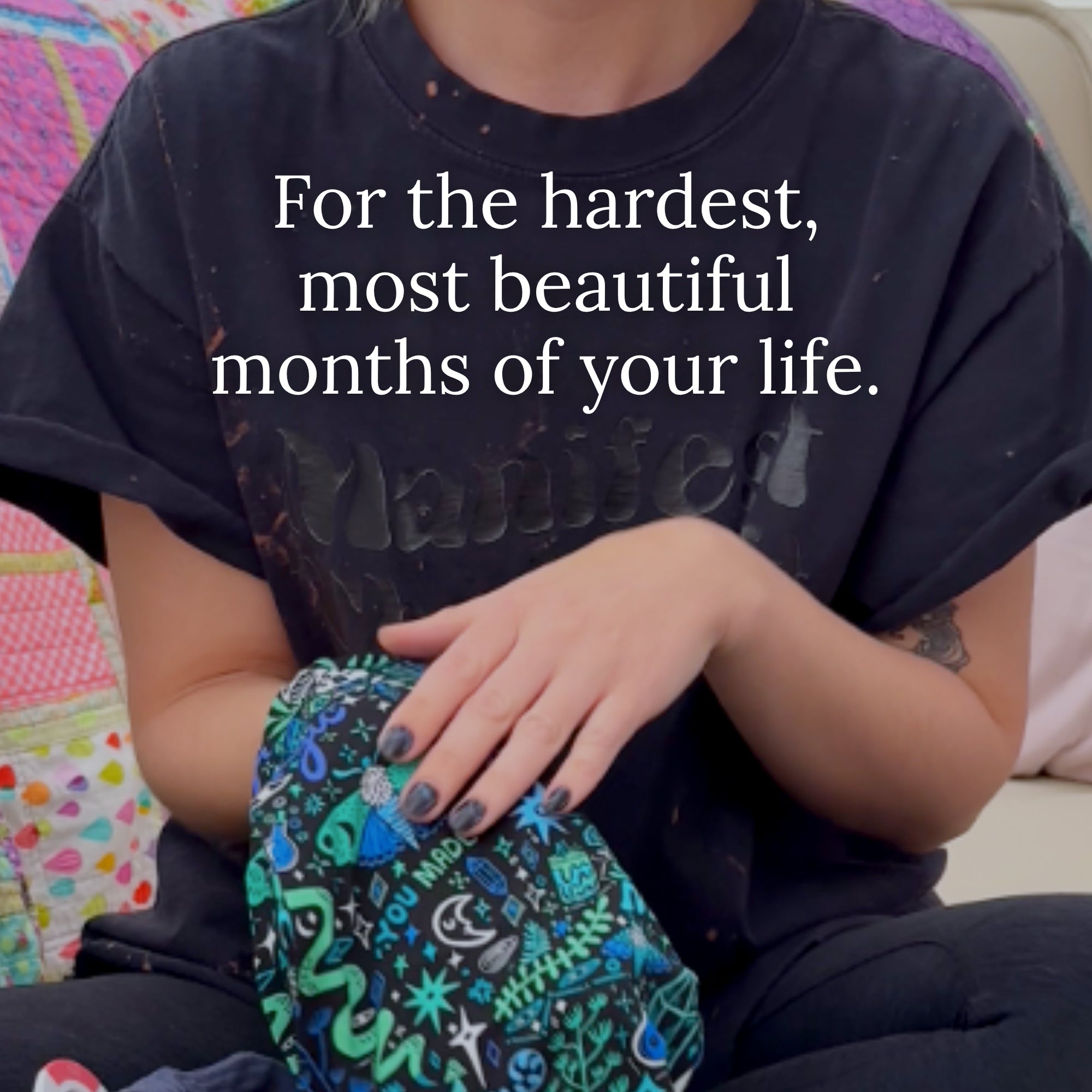 They’re not loud affirmations. They’re meant to blend gently into everyday life—on pajamas, blankets, and tiny outfits—offering small moments of reassurance when moms need it most.