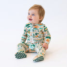 Outfitted with signature Raising Mama® "mama-at-peace" footie grips, this bamboo baby sleeper has elastic backing on the footies for a snug fit, and will hug those baby chubs for extra cozy snuggles.